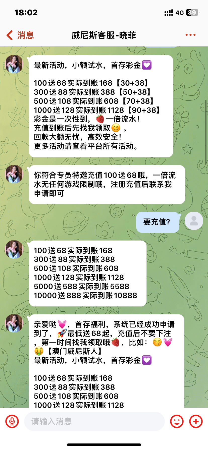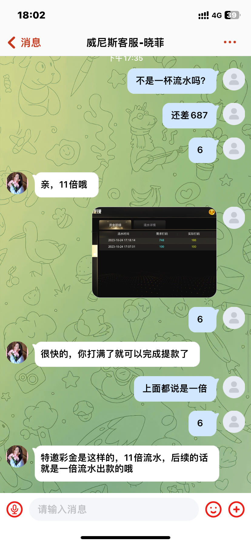 纯诈骗 打电话来说送68彩金 后面又叫充值100才送 它说一倍流水 后面我提款一看还差600多 去问了一下又说要11倍 真的诈骗