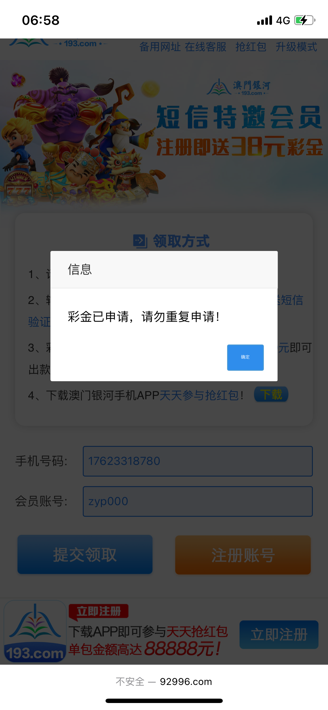可以先去链接里的自助领取彩金,输入手机号获取验证码,看看能不能收到验证码,能收到说明可以领,之后再注册领取。收不到无视即可。