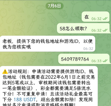 活动规则:申请活动需要提供游戏ID、钱包地址(钱包需要在2022年6月1日之前交易达到5笔或以上,审核期间该钱包需要转出一笔金额验证),彩金都需要满足5倍流水下分!不可重复申请!且该活动礼金最高可下分 188 USDT,超出金额需扣除! 发现同地址多次申请将取消资格移出群聊!
