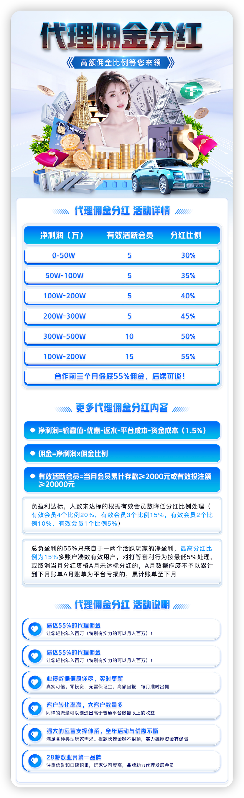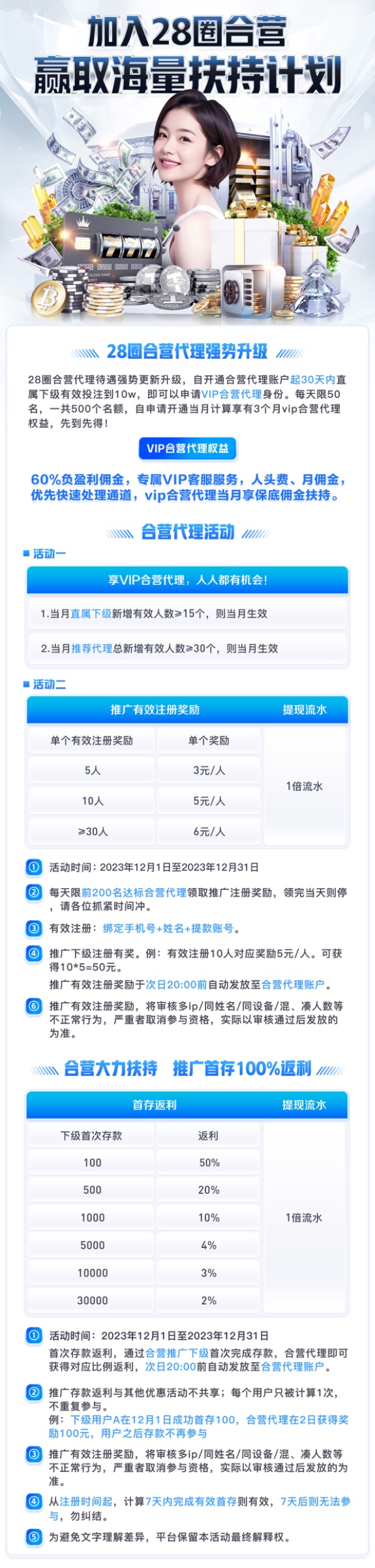 首次存款返利,通过合营推广下级首存完成存款,合营代理即可获得对应比例返利