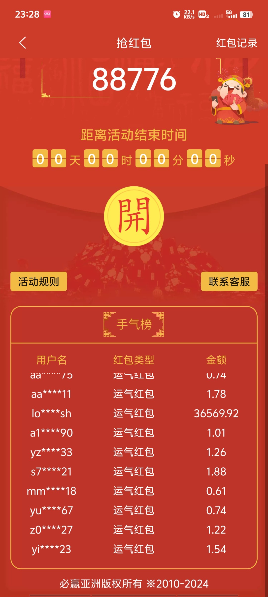 两个大包都给狗庄自己抢了你有意见啊,活动没说狗庄不能抢红包