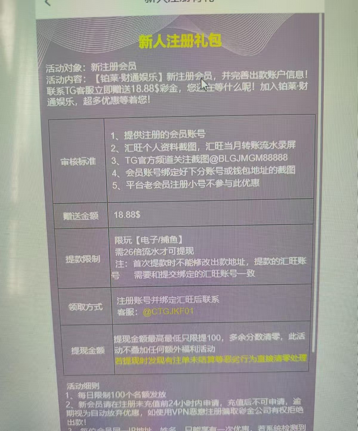 跟昨天老哥们发的那个铂莱活动一样的,但是这个客服好像只认汇旺,你们看看能不能搞吧!,我能领是因为有人给我发消息他那边报备的!