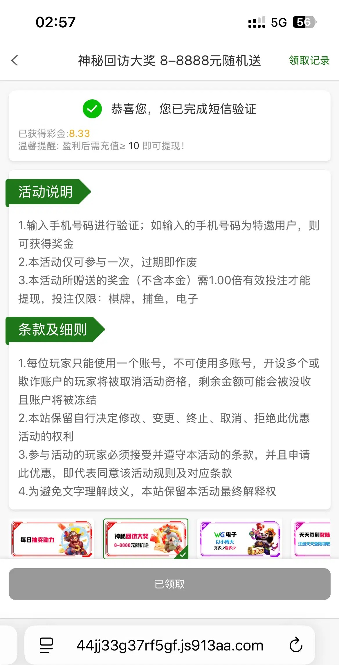 913.am,自助回访,我领了没打出来,打出来要充10,屌大的朋友上