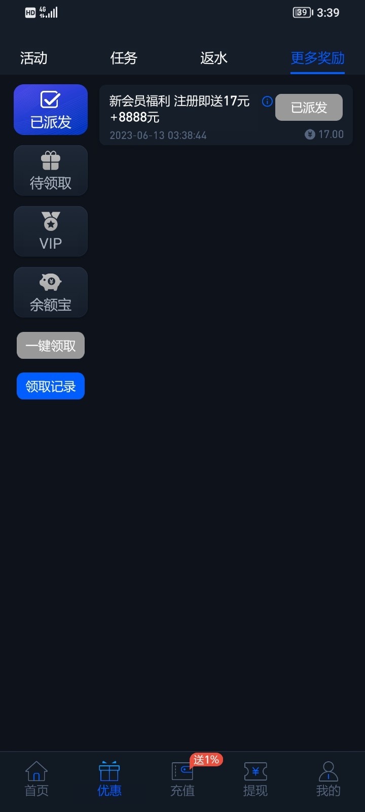 下载APP注册绑卡绑定手机号一个小时左右自动送17/100提现。送了要手动领取!