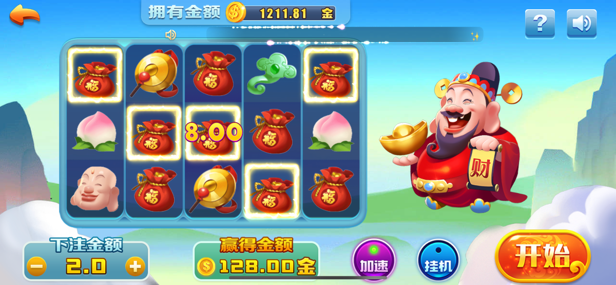 一开始上了100挂了 后面都上了100摇了两下财神到2 两块钱一转中间3排前百搭直接报的九百多块
